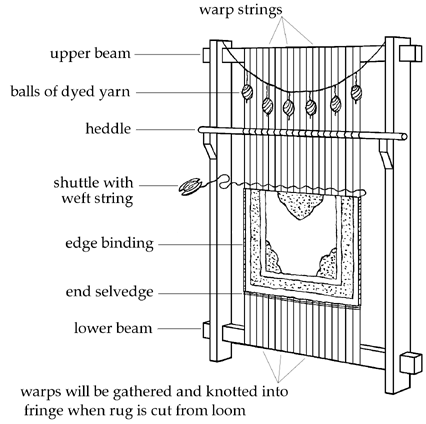 Village loom. Only slightly more sophisticated than nomadic looms, either driven into the ground or secured on a stable base, with two horizontal beams fastened at the top and the bottom of the uprights. Because they are vertical these looms allow the weaver easy access to every point across the width of the rug, and it is possible to produce much wider rugs. However, the overall size of rugs that can be made is restricted by the fixed beams, and village weavers rarely produce large carpets.