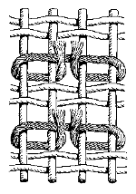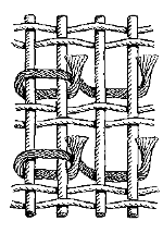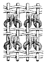 Jufti Knot Vastly inferior knot produced by tying the pile yarn around four or more warp strands, rather than the customary two. This increases the speed at which a rug can be woven but results in its being less compact and durable. Use of the jufti was rife in Persia and Pakistan, and are still made with it. These are usually other wise quite finely woven workshop rugs in which the weaver, to save time and money, has employed jufti knots on the single colored, unpatterned areas where a high knot count is not necessary to articulate the design. A simple method of telling whether a jufti knot has been used is to compare the horizontal knot count to the number or warps. If there are more than twice as many warps as there are knots, then the jufti knot has almost certainly been employed.