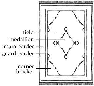 Anatomy of a rug Medallion - Any large central motifs used as the focal point a design. Field - Main area of the rug within borders. Spandrel or corners - Architectural expression used to describe the space between the curve of an arch and its enclosing molding. In rug making it refers to the contoured areas at the four right angles of of the field adjacent to the borders, usually only found in rugs employing a central medallion. Main border - The largest, and usually the central border. Minor border - Smaller, supplementary borders, usually arranged in equal numbers on either side of the main border. Guard strips - Narrow stripes within the border arrangement. They can be either plain or patterned, and are often indistinguishable from the minor borders. Ground - Sometimes used as an alternative expression for the field, but generally applied to the underlying or background color of any part of the rug. Motif - Any single form or cohesive group of forms (e.g., a bunch of intertwining leaves) which constitutes part of the overall design. Open field - Undecorated or monochrome field, usually only found in compositions with a central medallion. Variegated field - One in which an otherwise uniform all over or repeating design continues over different colored grounds. Paneled designs - The field is divided into panels or compartments. Repeating design - A single motif or group of motifs is repeated across the entire field. Endless repeat - Another term for a repeating design, which some experts have suggested is symbolic of eternity and the all pervading of Allah. Dyer’s palette - The range of colors and tones in particular rug or group of rugs.